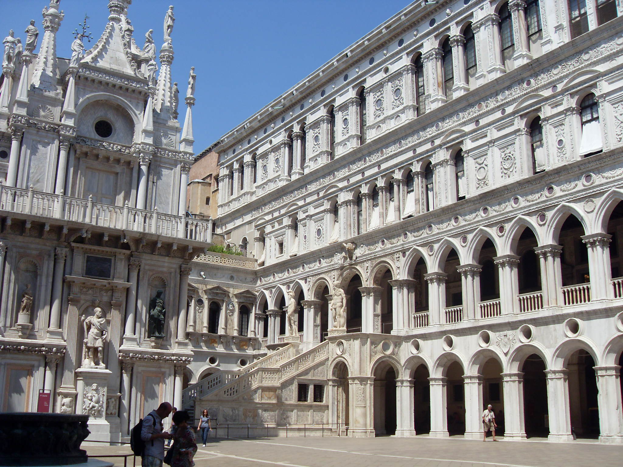 Andei por grande parte da região, passando pelas principais ruas do comércio. O lugar é realmente mágico! Só não estava mais perfeito por conta do calor que era insuportável. Comprei uma pashimina falsificada em uma das lojinhas por apenas € 5.00 (o melhor negócio que fiz na Itália! Ela foi minha companheira em toda a viagem, pois se transformava em xale e saia para que eu pudesse entrar livremente nas rigorosas igrejas italianas). Também visitei o Teatro La Fenice, um teatro no qual sua construção iniciou no final do século XVIII, mas houve tantos incidentes e reconstruições que foi chamado de La Fenice – A Fênix, pois literalmente renasceu das cinzas. Ele é um teatro pequeno, mas magnífico! Depois do almoço, fomos conhecer o Palácio dos Doges (foto abaixo) ou Palazzo Ducale (em italiano).