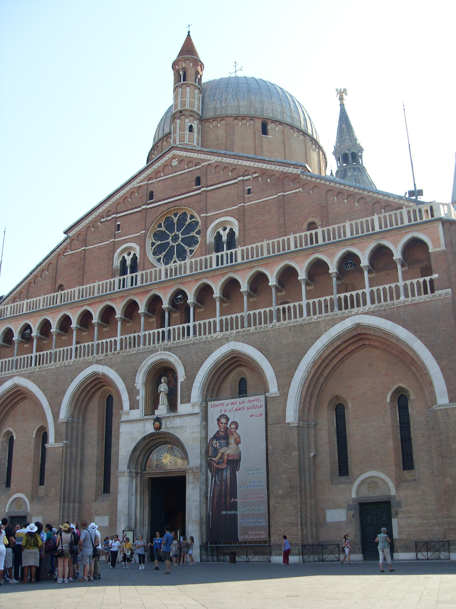 Hoje nosso passeio começou muito cedo, pois visitaríamos 4 cidades em um mesmo dia. Saímos de Veneza em direção à Pádua ou Padova (em italiano). Pádua é conhecida como a cidade onde Santo Antônio passou grande parte de sua vida. Possui pouco mais de 200 mil habitantes e está na região do Vêneto, como Veneza. A cidade também é famosa por possuir uma das mais antigas e prestigiadas universidades europeias. Fomos conhecer a Basílica de Santo Antônio (foto), uma igreja construída a partir do séc. XIII, logo após a morte do santo.