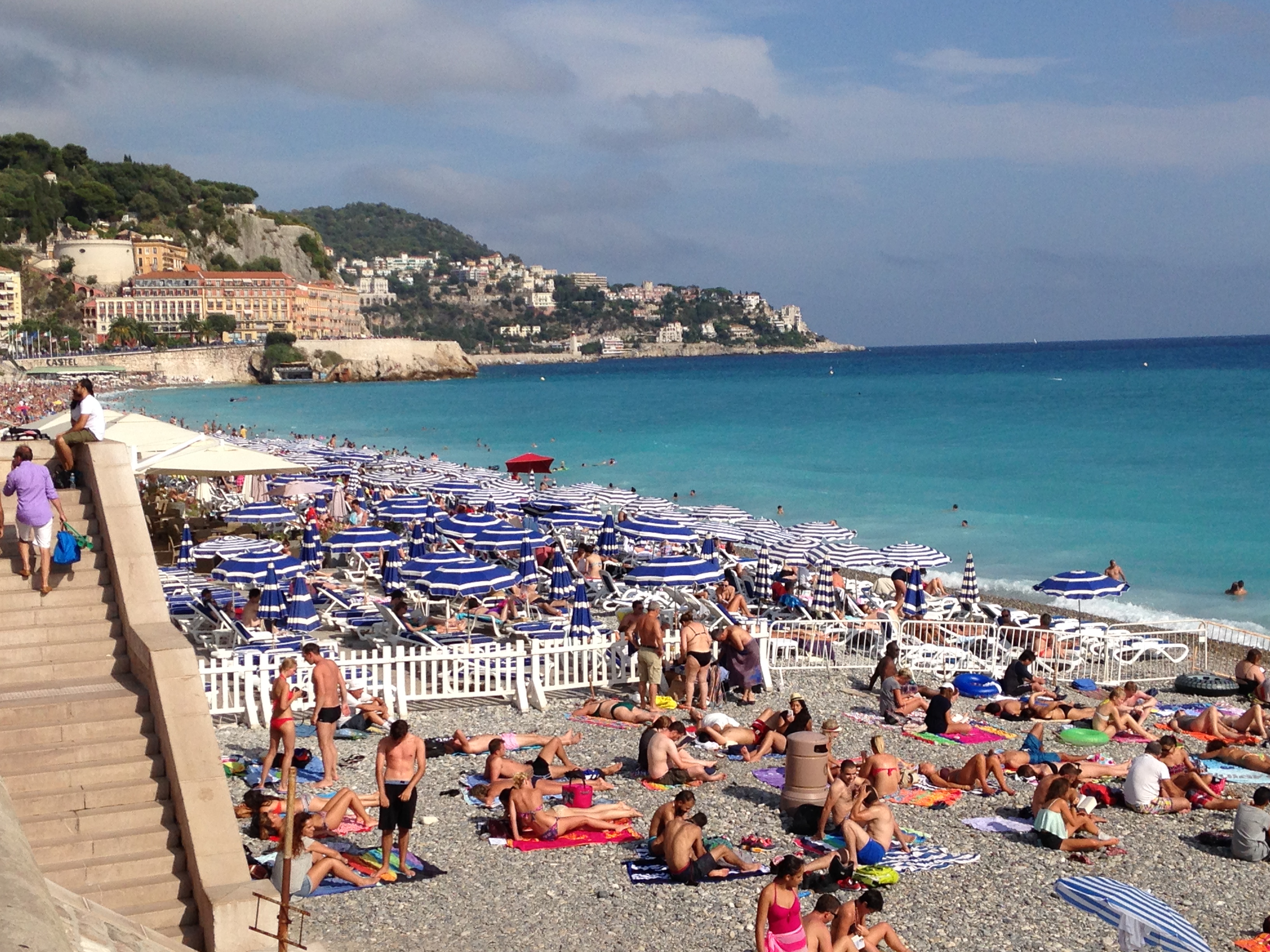 Para ser sincera, a Vieux-Nice não me impressionou muito. Essa região se assemelha a Itália, mas é uma parte feia da Itália, cheia de prédios mal cuidados, mofados e roupas expostas na janela. Parecia um cortiço! Na verdade, toda essa região tem uma forte influência da Itália, pois já fez parte do território italiano no passado. Ahhh! Vocês sabiam que Giuseppe Garibaldi, um dos idealizadores da Revolução Farroupilha no sul do Brasil nasceu em Nice?! Voltando ao passeio, logo acima do centro histórico passei pelo Chateau de Nice, um local onde havia um antigo forte e que hoje oferece as melhores vistas panorâmicas da cidade (a subida é meio pesada, mas as vistas são lindas!). Saindo do centro histórico, ainda andei pela Promenade des Anglais, a Avenida Beira Mar. É um lindo boulevard no qual é possível ver a praia com o mar azul e onde estão localizados os principais hotéis da cidade. Devo alertá-los que as praias na França são um pouco diferentes das praias brasileiras. Em grande parte delas, não há areia e sim pedras. Além disso, as pessoas em geral não levam seu próprio guarda-sol e cadeira. Elas alugam todos os apetrechos dos clubes. Esses clubes estão localizados dentro da praia, próximos ao mar, e além de alugar todos os equipamentos necessários, ainda oferecem banheiros e estabelecimentos gastronômicos.
