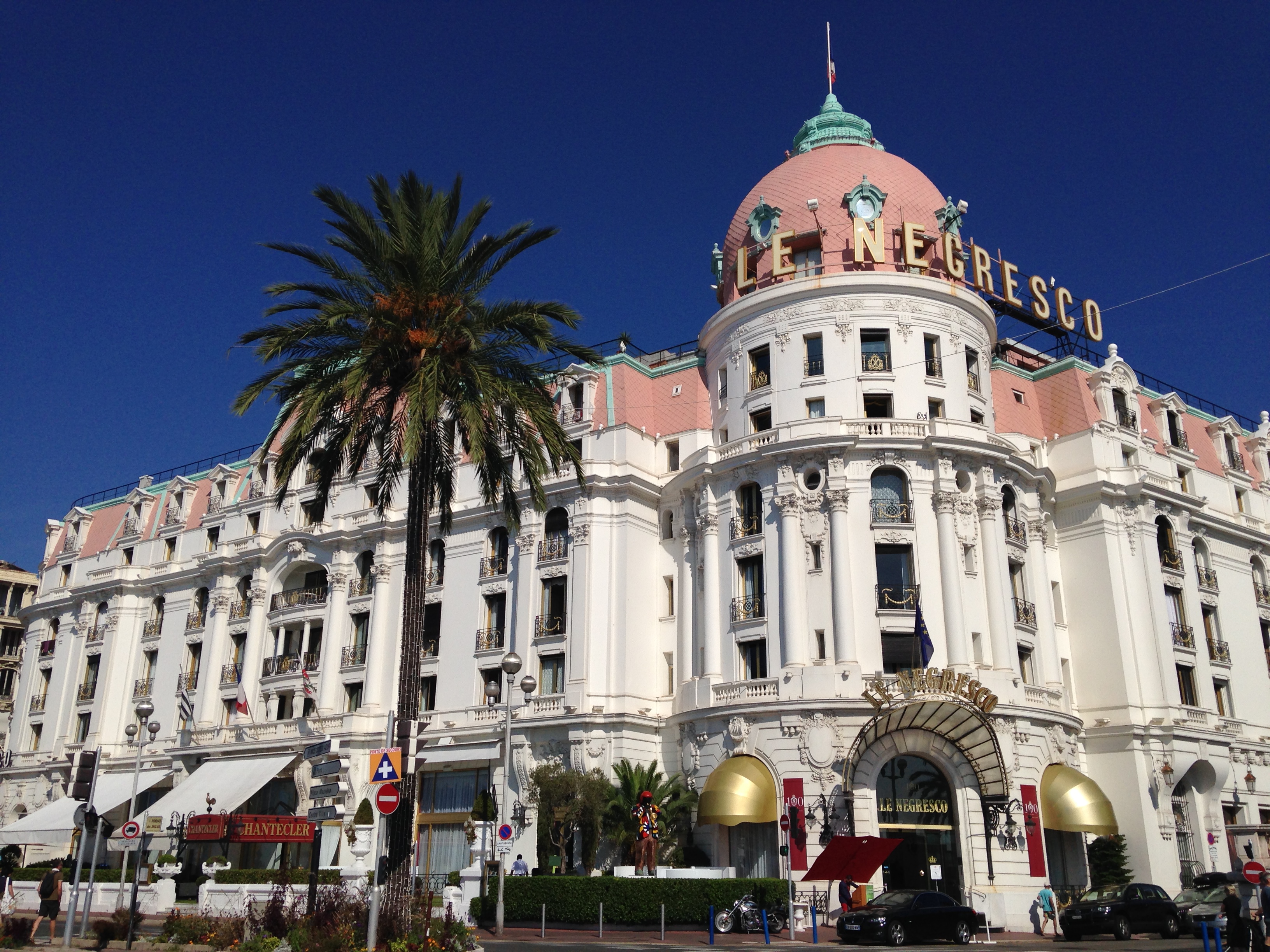 Na Promenades des Anglais é possível encontrar o icônico Hôtel Le Negresco (vou falar mais sobre ele abaixo) e o Musée Masséna (um lindo casarão do final do século XIX que mostra um pouco da história da cidade de Nice. O palácio é lindo e o andar térreo mostra os riquíssimos detalhes da decoração daquele período. O segundo e terceiro andar são mais ou menos, mas é outro museu gratuito). Abaixo é possível ver os edifícios do Hôtel Le Negresco e do Musée Masséna.