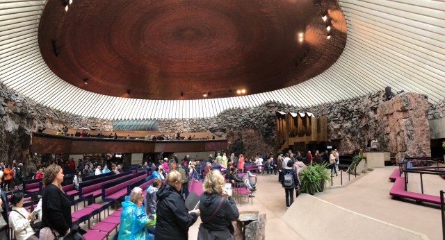 Por fim, meu último atrativo em Helsinque foi a igreja de Pedra (Temppeliaukio kirkko), uma igreja luterana construída no final da década de 1960. A maior parte da igreja é subterrânea, construída a partir de uma rocha maciça de granito, cujo interior foi extraído para dar forma às paredes.  É o atrativo mais disputado da cidade com filas na entrada e o ingresso custa € 3. Interessante!