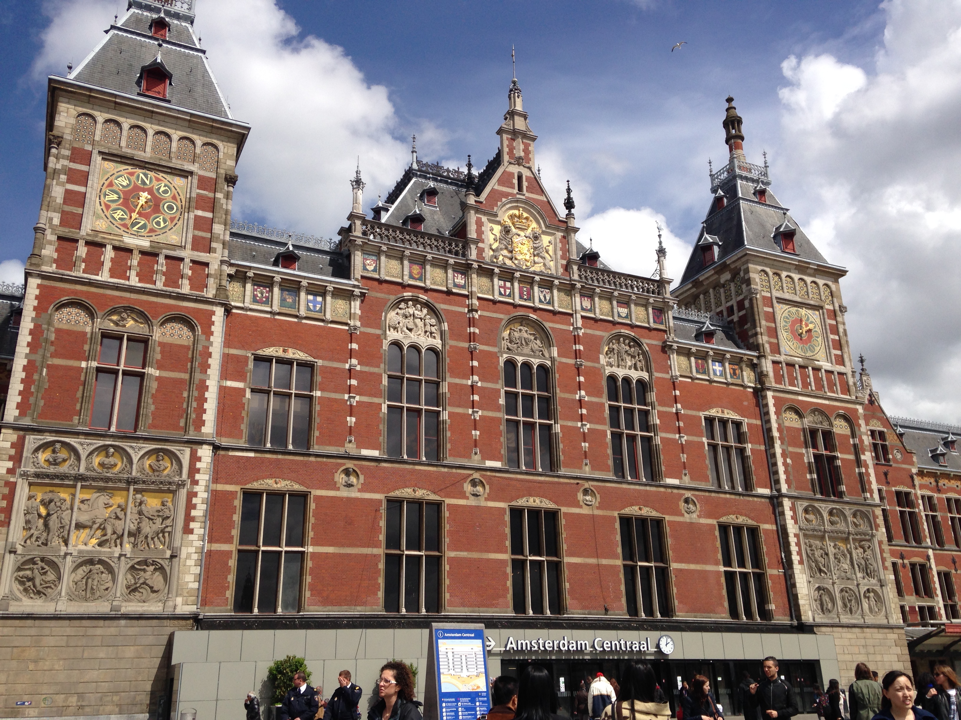 Cheguei à Amsterdã de trem e levei quase 4 horas de viagem saindo de Bad Honnef (paguei € 68 no trecho de ida e volta, mas comprei com bastante antecedência, tô ficando mais esperta!). Cheguei à Amsterdam Centraal (principal estação de trens) logo após o almoço. A Estação já é um atrativo a parte. Ela tem uma das fachadas mais bonitas de toda Amsterdã, parece um palácio. Uma pena que o interior seja tão caidinho!  Deem uma olhada…