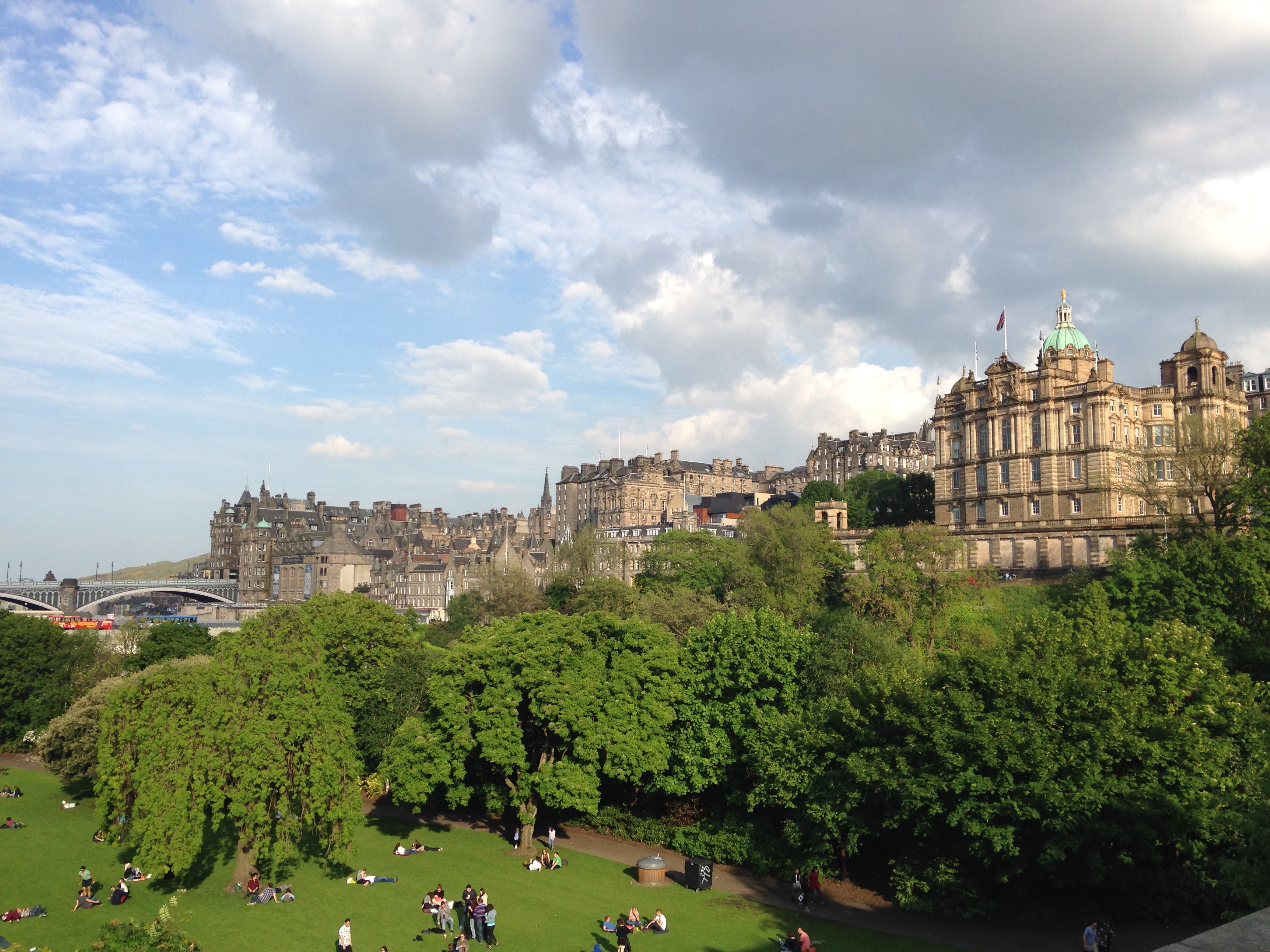 E terminei meu passeio no Princes Street Gardens, o mais charmoso parque da cidade. O parque era um alagado que se transformou em um dos principais atrativos de Edimburgo. Ele está situado entre a Cidade Nova e a Cidade Velha! Lendo outros blogs de viagem, vi que muitas pessoas comentavam a beleza deste parque. Entretanto, devo admitir que ele superou todas as minhas expectativas. Ele não é só lindo, ele é magnífico! Além de ser extremamente bem cuidado, acho que nunca vi tantas espécies diferentes de flores juntas. Ademais, o dia bonito e ensolarado trouxe ao parque famílias inteiras fazendo piquenique, “tomando um bronze” ou só deixando o tempo passar. Fiquei apaixonada pelo lugar! Deem uma olhada nas duas fotos abaixo para vocês sentirem a beleza do local. Ahh! Ao lado do parque, há a igreja de St. Cuthbert, uma das paróquias mais antigas de Edimburgo. Ela é circundada por um cemitério meio macabro, mas legal. À noite, apenas  aproveitei meu hotel.