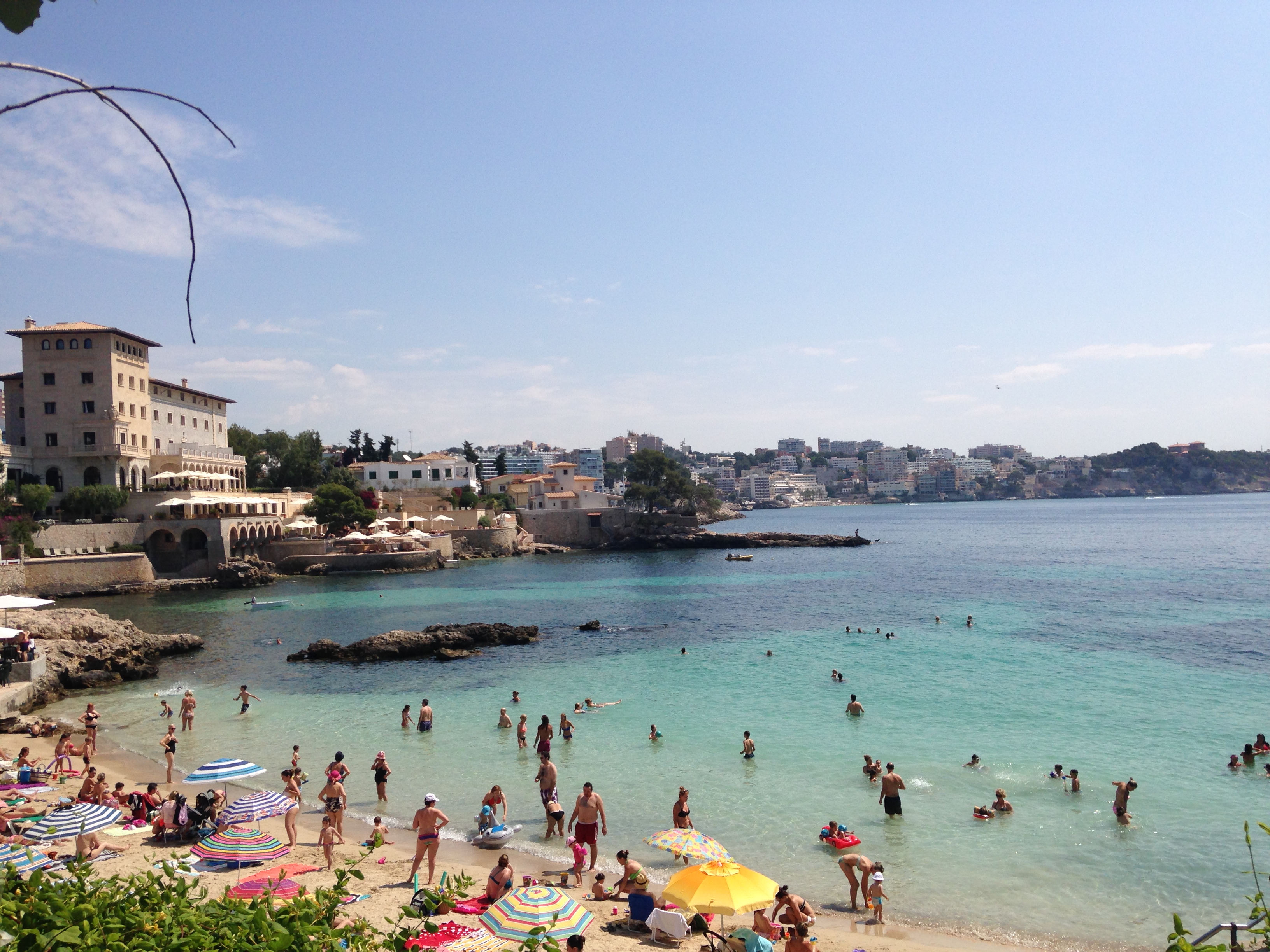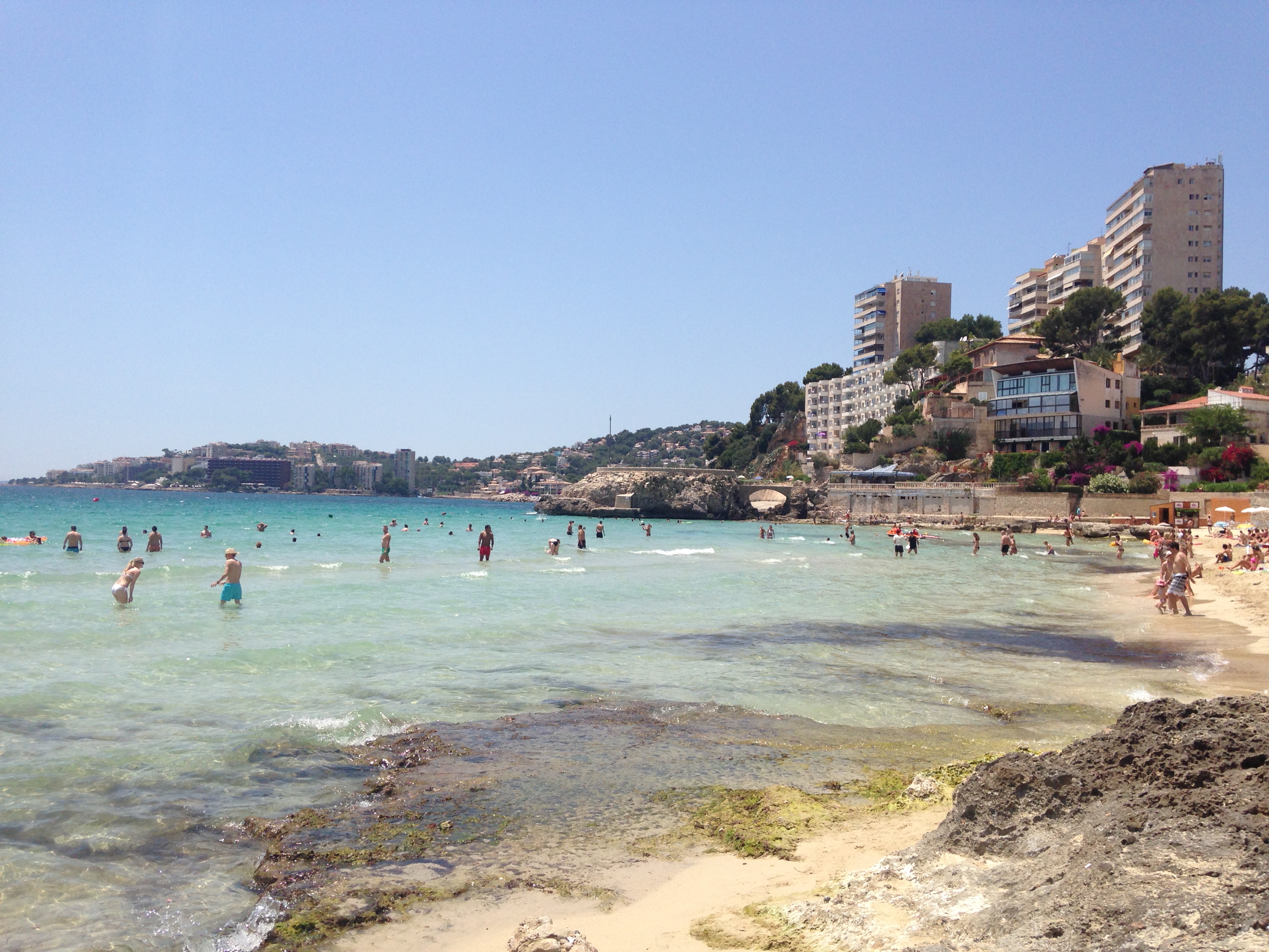 Acordei cedo, pois queria visitar a parte mais oeste da cidade. Primeiramente fui conhecer duas praias de Palma; a Caló des Macs e a Cala Major. A tonalidade da água realmente impressiona, mas a faixa de areia é muito pequena, a areia é muito grossa e a praia tem muitas pedras. Neste quesito, nossas praias brasileiras ganham de lavada. Deem uma olhada! A primeira foto é da Caló des Macs e a segunda é da Cala Major.