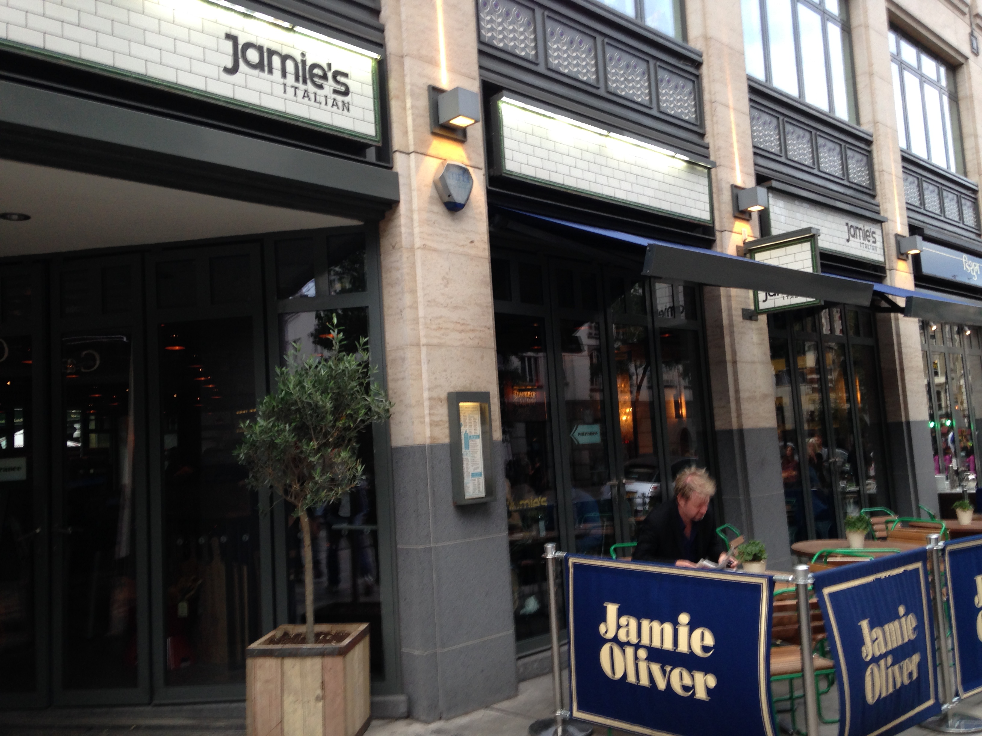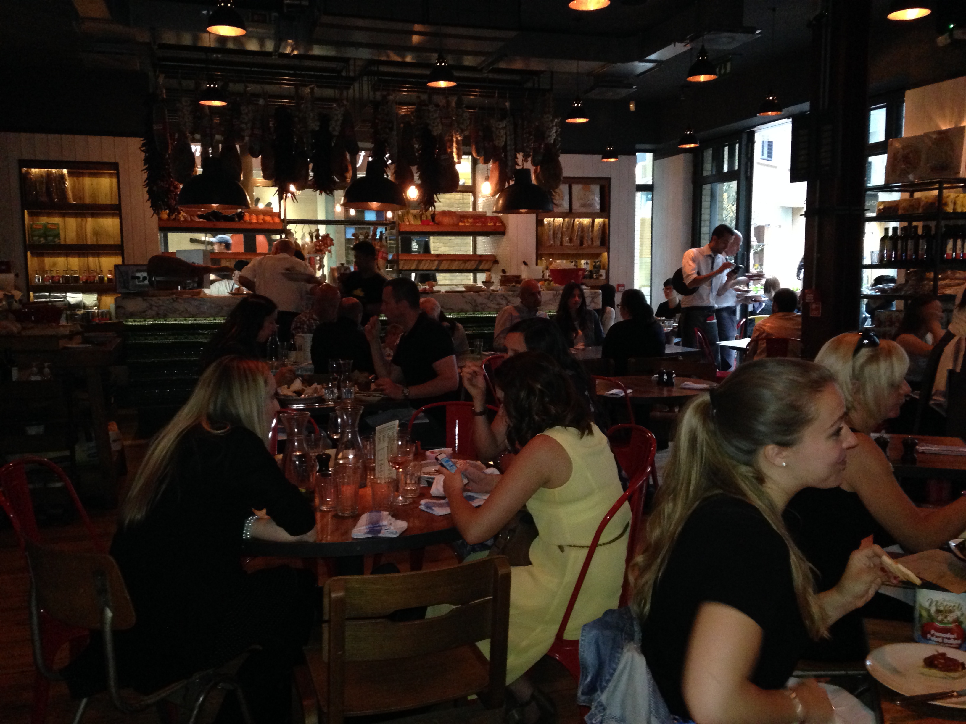 Durante minha última viagem conheci três diferentes lugares. O primeiro foi o Jamie´s Italian. Idealizado pelo Jamie Oliver, este restaurante tenta mostrar a autenticidade da cozinha italiana por meio de práticos rústicos, utilizando os melhores e mais frescos ingredientes. Eu fiquei muito decepcionada com o Jamie Oliver por ele ter “desdenhado” o brigadeiro e o quindim em uma viagem recente ao Brasil. Achei o comentário dele de uma deselegância e rudeza completa. Mas eu quis ir ao restaurante dele para ver se sua comida era tão boa assim! Visitei a filial em Covent Garden. O ambiente é bem bacana; oferece essa combinação do rústico com a autenticidade italiana. Estava lotado (fiquei na fila de espera por 30 minutos)! Eu pedi um fettutine com camarões ao molho de tomate cereja e vinho branco. Mesmo que a pasta tenha sido preparada no mesmo dia e que o molho seja caseiro, achei o sabor bem normal. Esperava muito mais! Na sobremesa, pedi uma pavlova (um suspirão) com creme e calda de framboesa. Não sei se é melhor que um bom brigadeiro! Enfim, segue abaixo uma foto da fachada do restaurante e de seu interior.